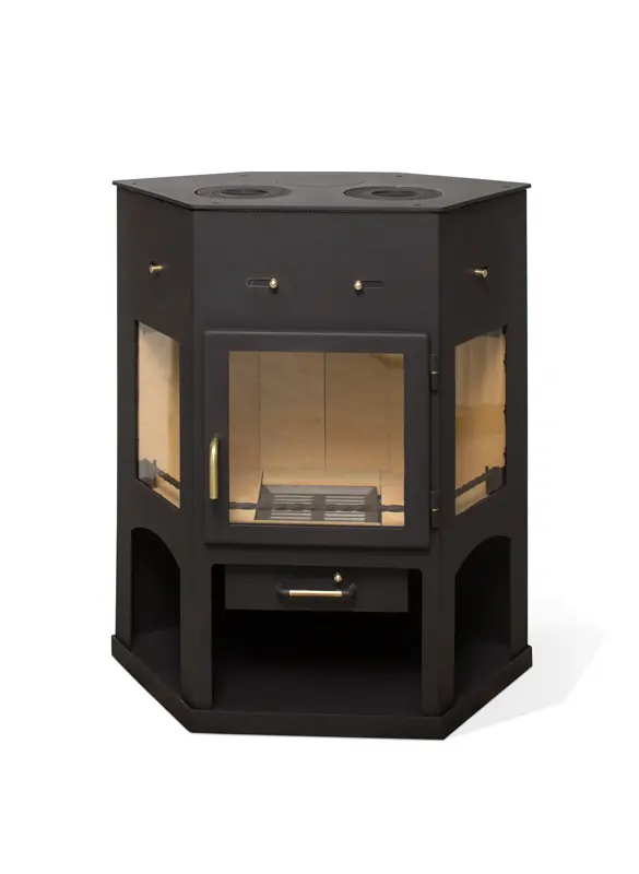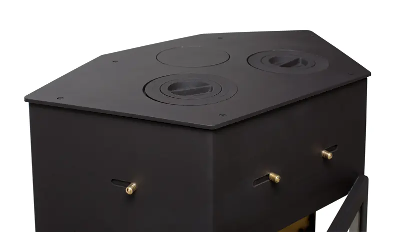 Объемная печь-камин “Енисей” с плитой от белорусского бренда “Мета-Бел” отлично подойдет для того, чтобы обогреть помещение площадью 55-110 кв. м. А расположенная в верхней части варочная панель с двумя чугунными конфорками позволит разогреть или приготовить пищу. При необходимости печь заменит мини-кухню или послужит резервным вариантом на случай отключения электричества или газа.