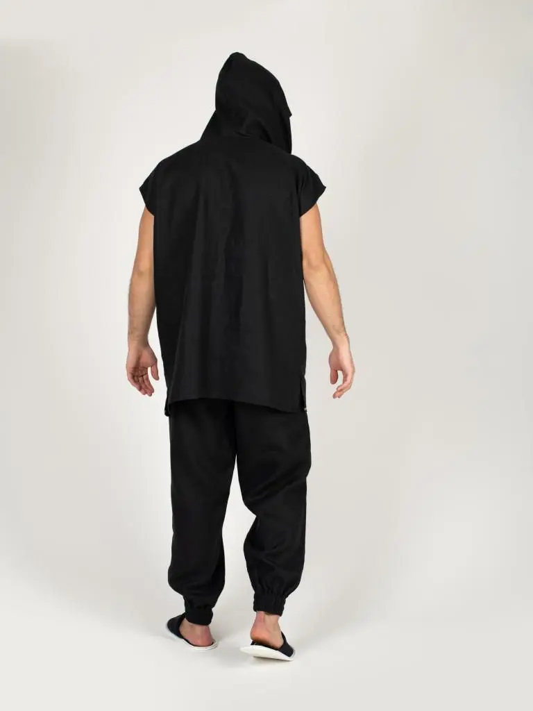 Комплект для пар-мастеров выполнен из натуральной и экологичной ткани - лён. В одежде из льна в банном пространстве не жарко, так как ткань хорошо пропускает воздух. Ткань из льна прочная и имеет противобактериальные свойства. Комплект состоит из свободной рубашки с капюшоном, брюк на резинке на талии и внизу штанин. Рекомендация по стирке: деликатный режим, не более 40 градусов.